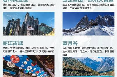 深度体验:石林风景区;丽江古城;玉龙雪山、冰川大索道;蓝月谷;双廊古镇;喜洲古镇;崇圣寺三塔;大理—海舌公园;圣托里尼;丽江—印象丽江。特色餐饮:石林—鲜花宴。